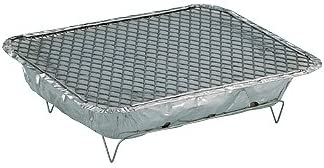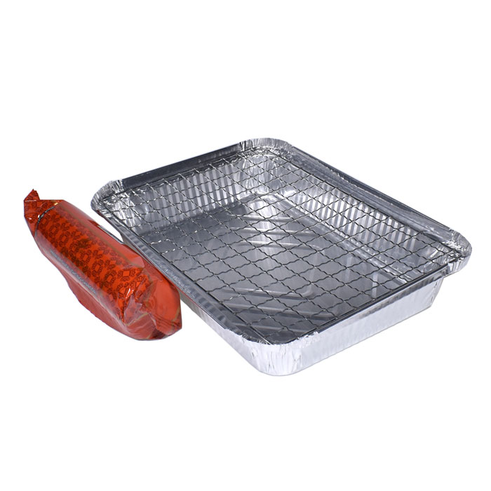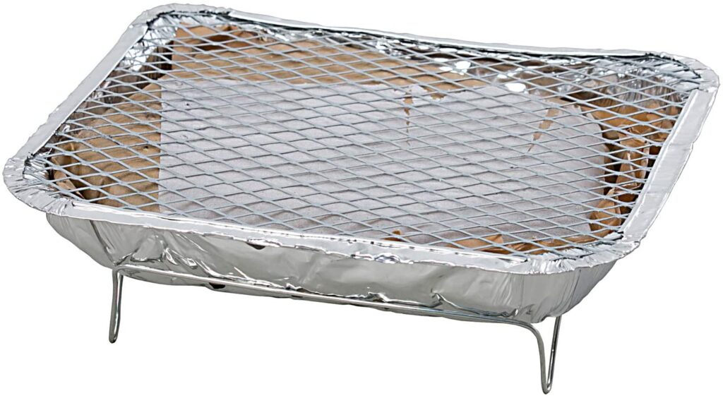 着火剤と炭、網、コンロ、スタンドがセットになった製品で、本体はアルミ箔製です。