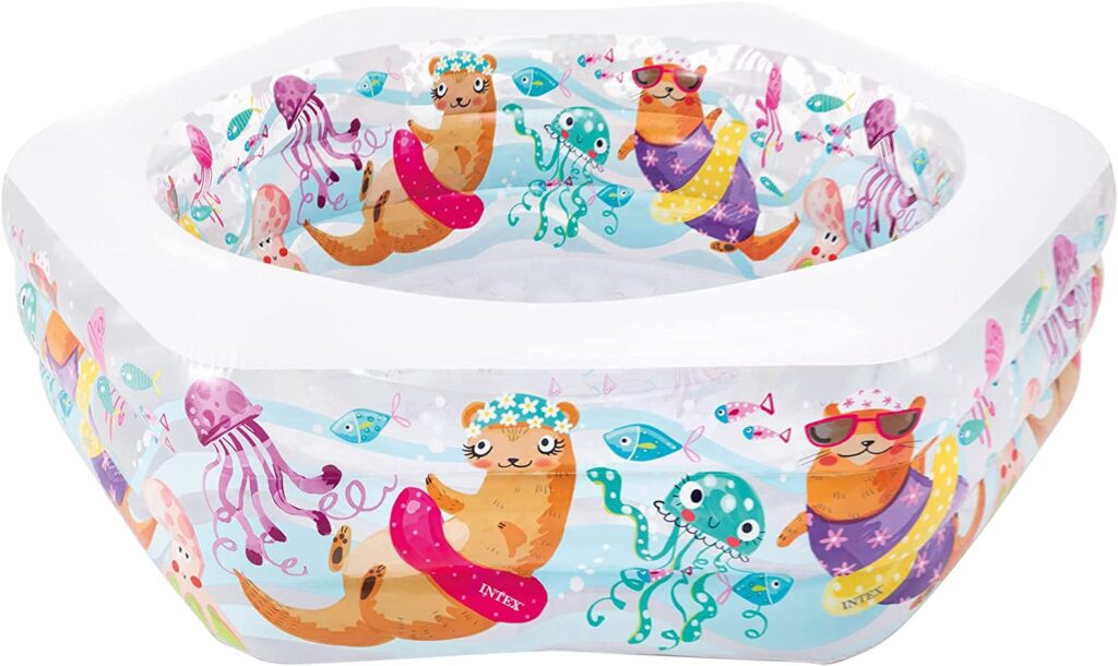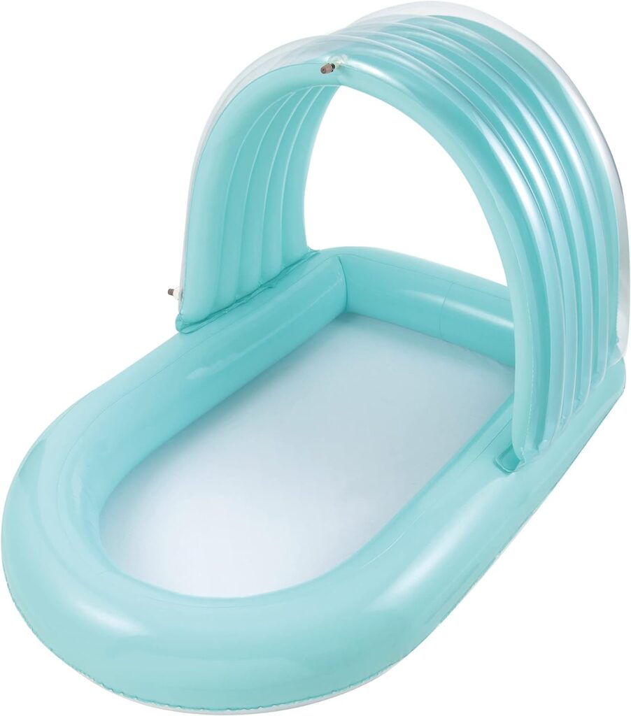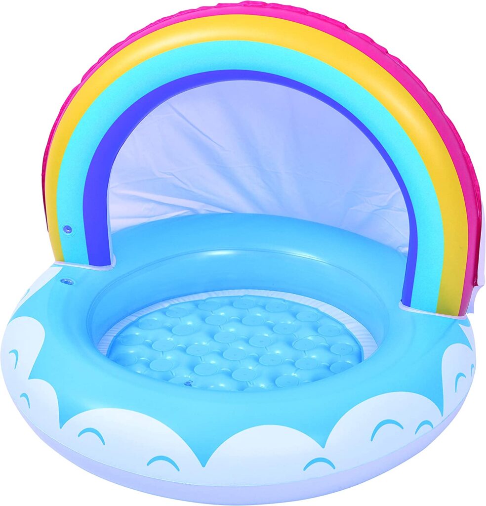 すごく可愛くて、小さいので場所も取らないし、水も少なくて済むし、日除けもついてて、地面との接触面も空気が入ってクッションになっているのでフワフワしてるのもいいです。