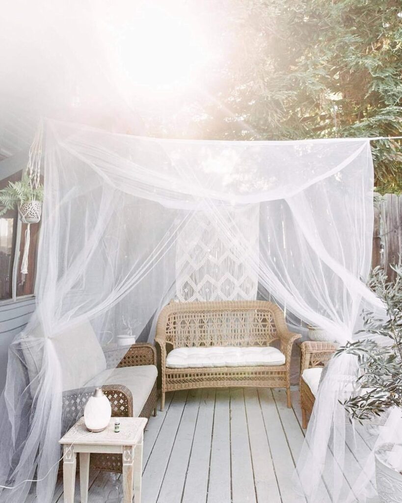 ベッドをおしゃれに彩るだけでなく、虫よけや風よけにもなる「天蓋カーテン」。