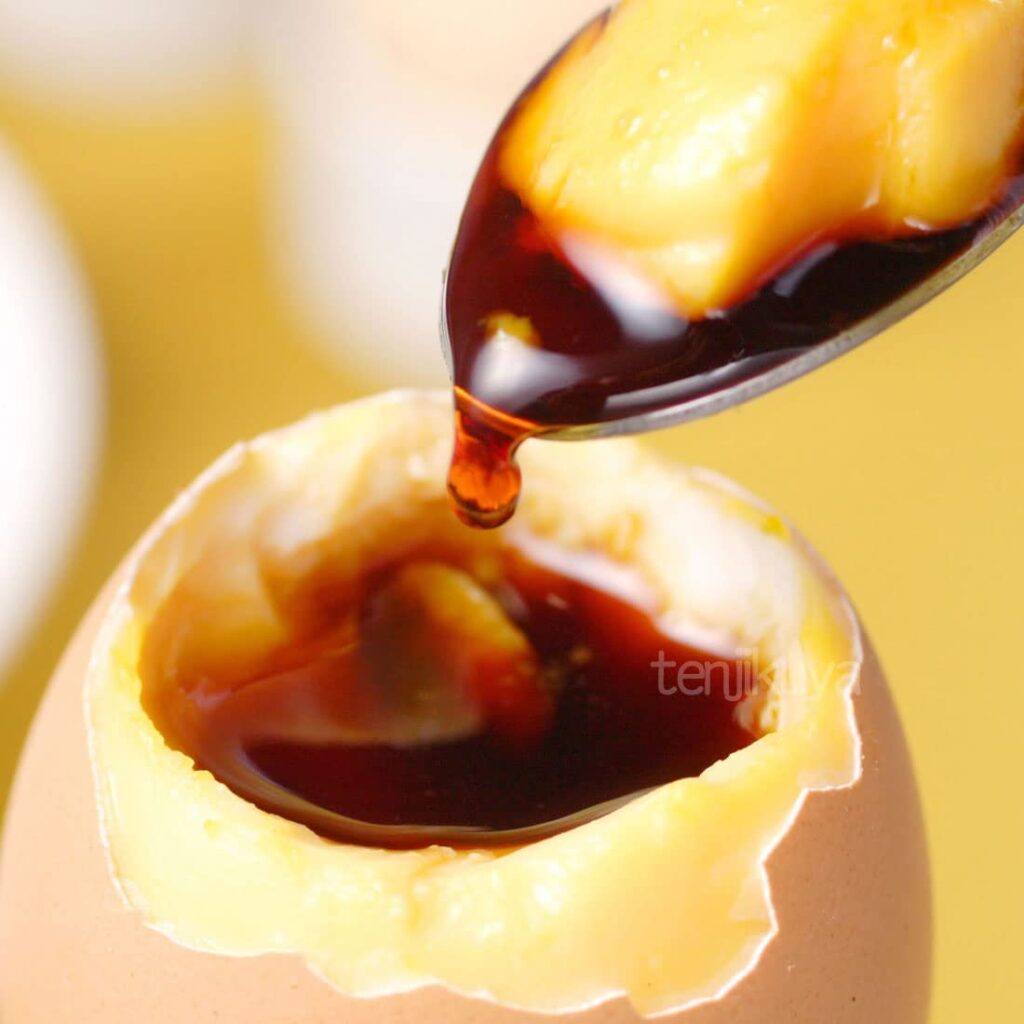 卵の殻を割って、付属のカラメルソースをかけていただきます。