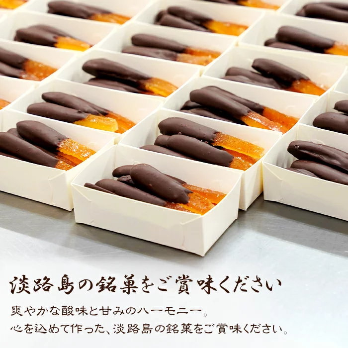 淡路島でしかとれない、幻の柑橘とも呼ばれる〝淡路なるとオレンジ〟を、職人が1点ずつベルギー産のチョコレートでくるんだ、手作りのお菓子です。