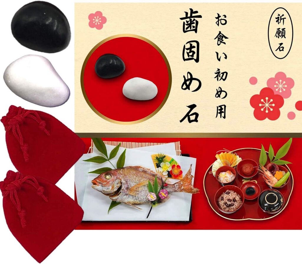 使用後は袋や箱に入れて保管できるものや、説明書付きでお食い初めの儀式の手順を確認できるもの、予め洗浄や消毒されているものなど、さまざまな「歯固め石」が展開されています。