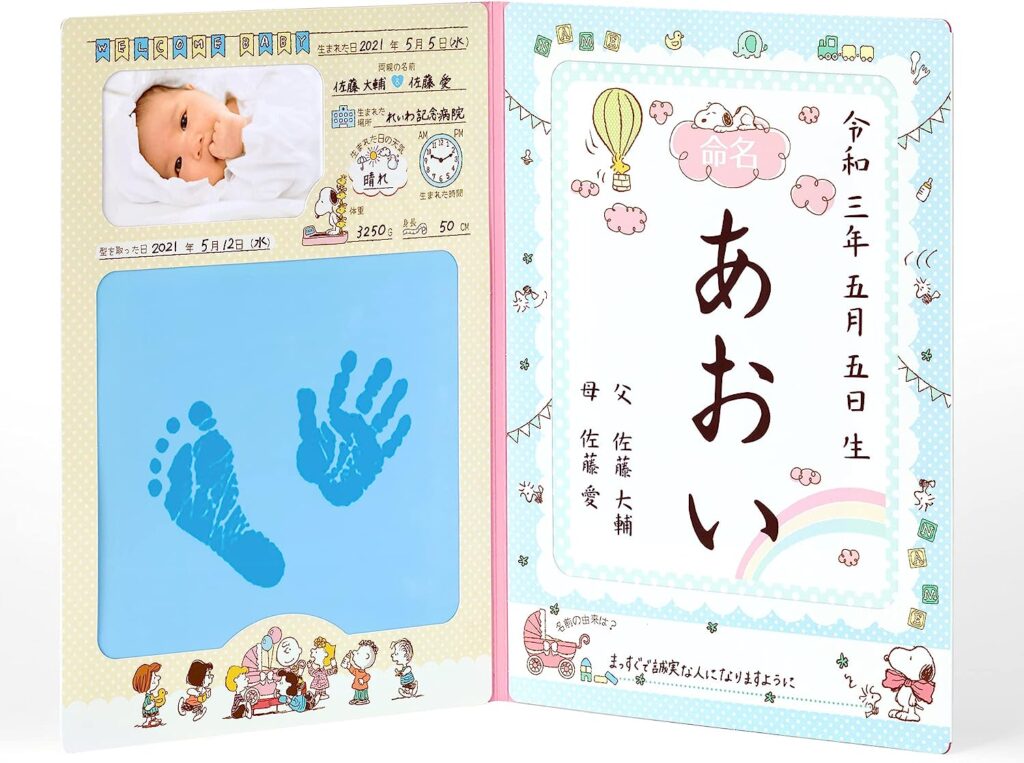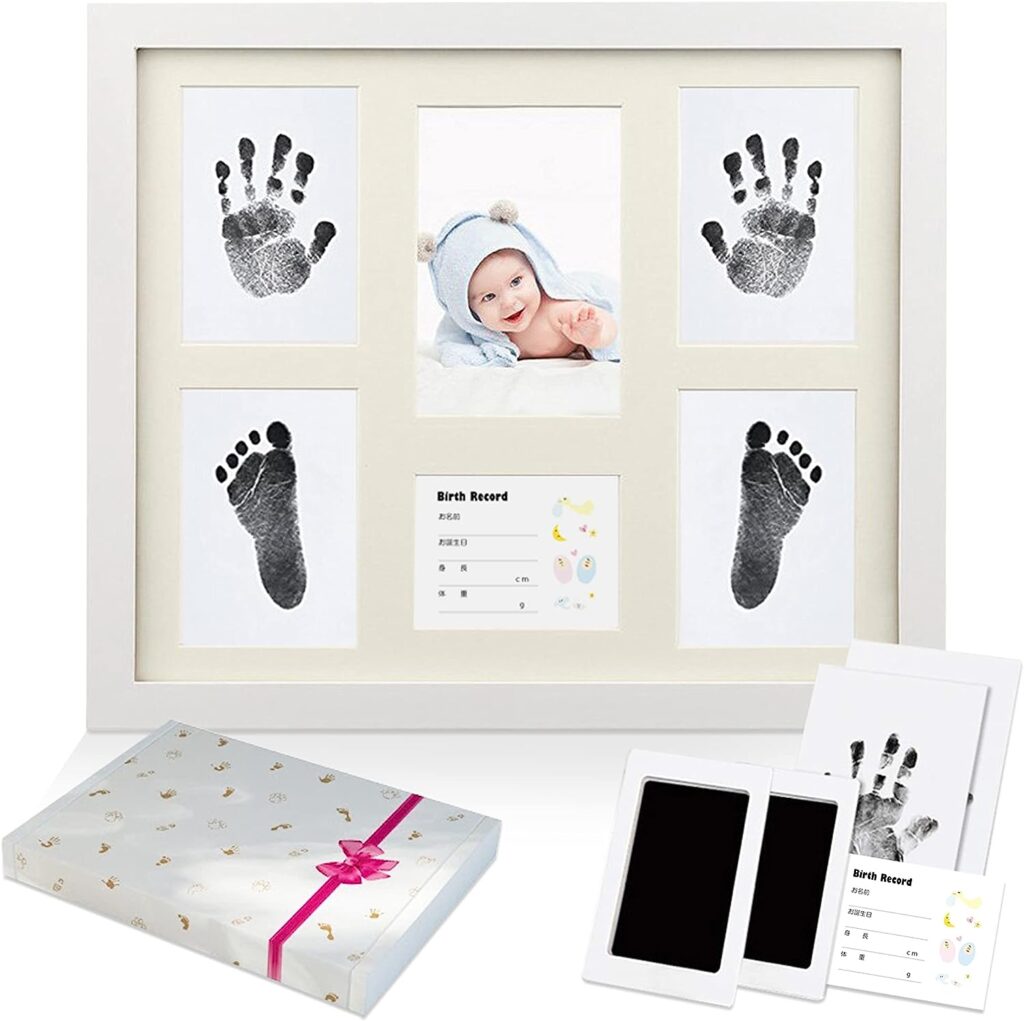 また、下画像のように、フォトフレームやお名前カードも付属されているので、生まれたばかりの子どもの手形や足型を残して飾りたいという方にとくにおすすめです。