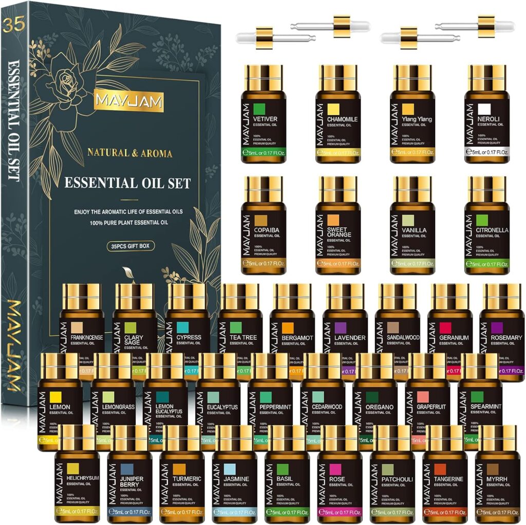 35本セットは、5mlのエッセンシャルオイル35種類と、スポイトがセットになっています。