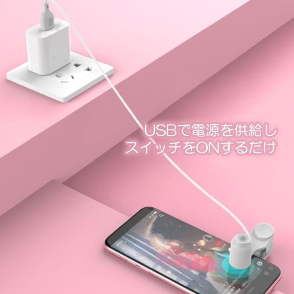 USBケーブルを電源に接続し、スマートフォンにクリップで固定して使用します。