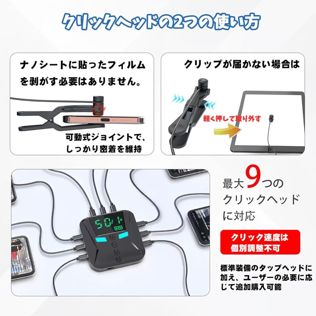 最大で9台のスマートフォンに接続でき、同時にオートクリックできます。