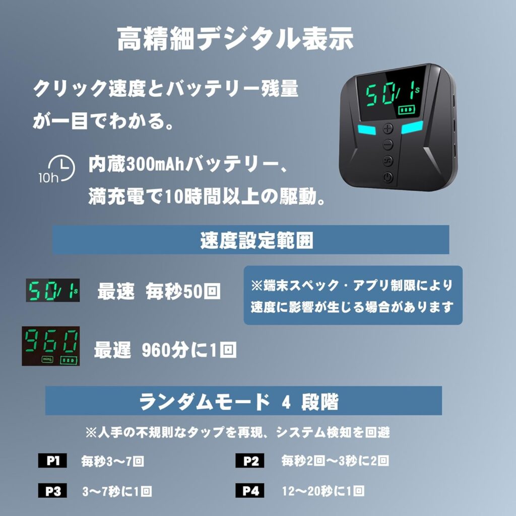 カチカチ音が鳴らない無音仕様や、人間っぽく不規則に押してくれるランダムモードなど、使う側のリアルな悩みをよく分かっている設計に感心しました。
