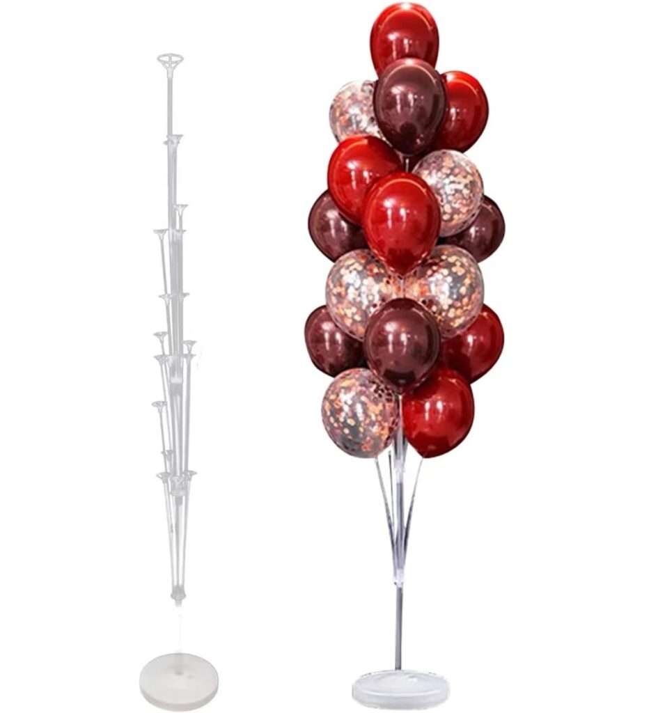 風船を6個設置できるスタンドと、バルーン、空気入れ、両面テープなどがセットになっています。
