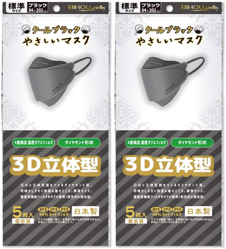 4.【日本製・立体型】ビホウマスク 3D立体型 クールブラックやさしいマスク 5枚入り 2袋セット 幅20.2×高さ8.4cm