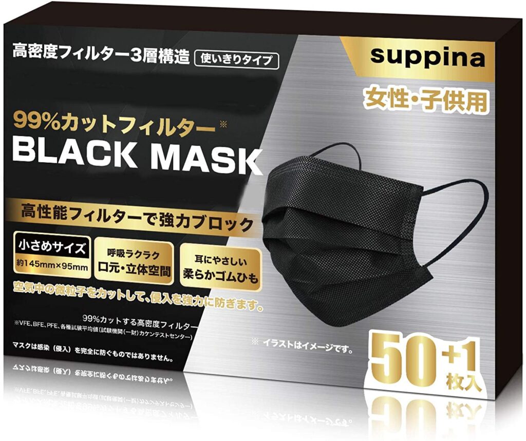 5.【立体型】Suppina 黒マスク 小さめサイズ 51枚入り 幅14.5×高さ9.5cm