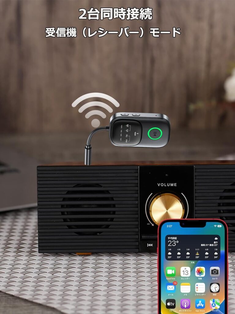 受信モードでは、古いスピーカーやカーオーディオに接続して、スマートフォンなどで再生したい音楽を流すことができます。