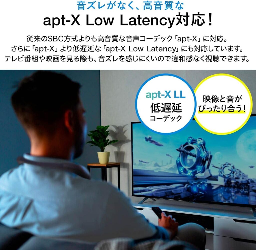 apt-X Low Latencyに適応しているので、音の遅延なしでテレビの視聴を楽しめます。