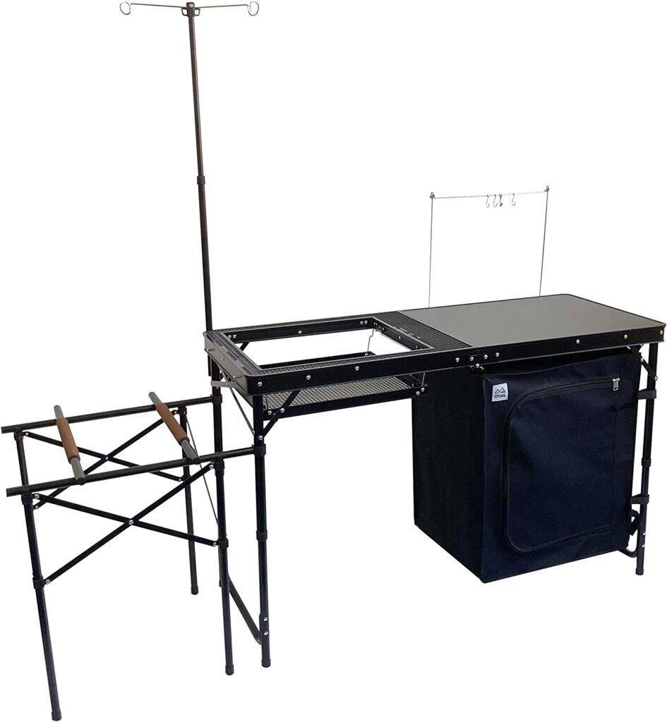 こちらは、「焚き火テーブル」として使用できるだけでなく、ランタンハンガー、フルクローズ収納棚、バナースタンド、キッチンツールハンガーなど、キャンプに便利な機能が多く備わっています。