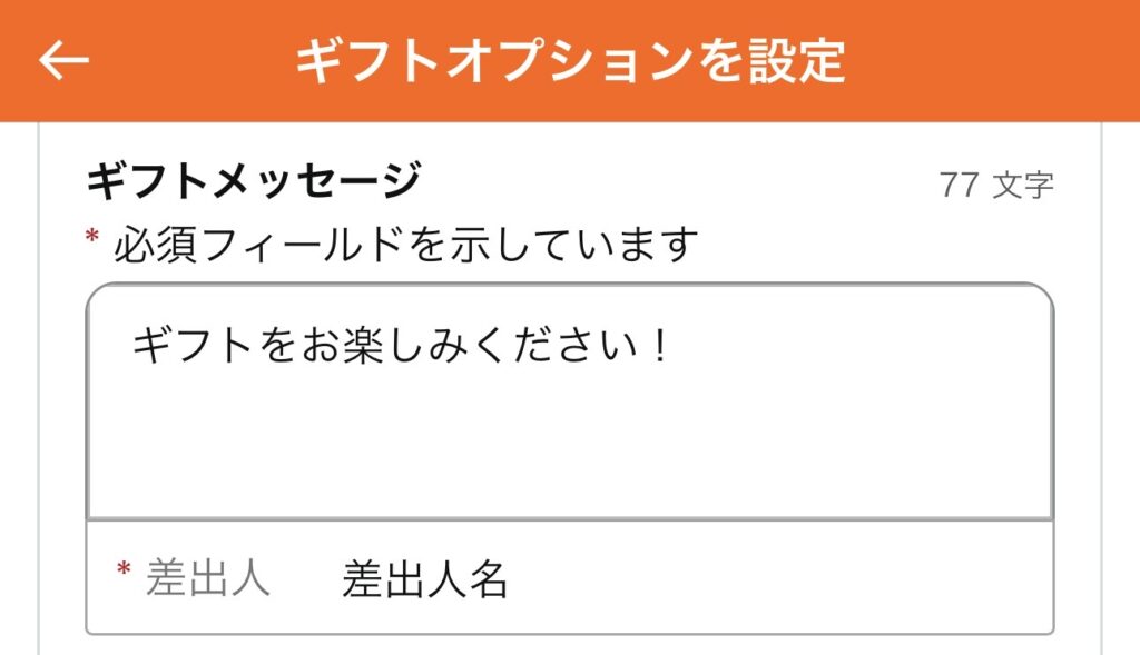「ギフトオプションを設定」の画面で、「ギフトメッセージ」と「差出人名」を入力します。
