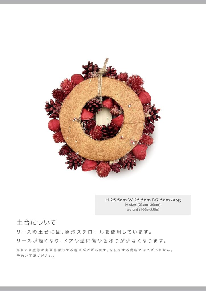 リースの直径は17cmと小さめで、初心者でも作りやすいです。