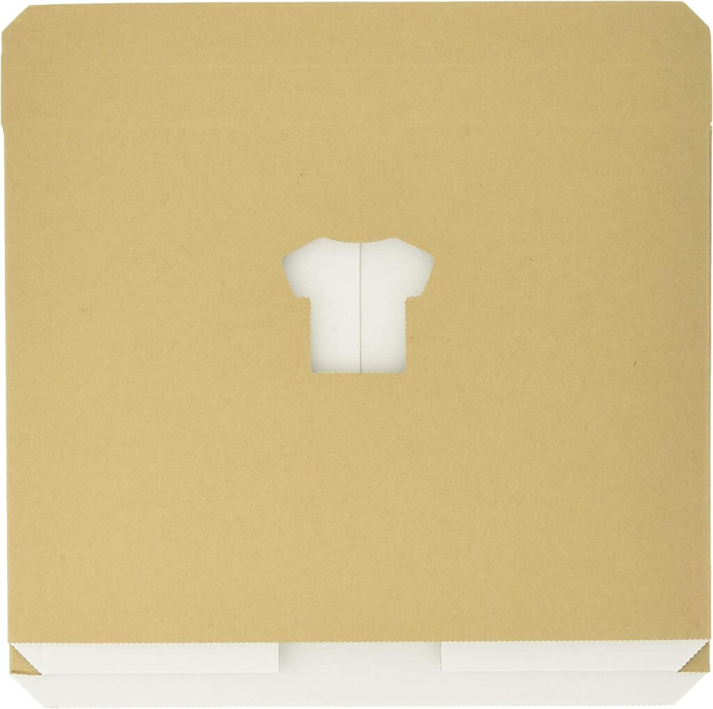 薄いプラスチック製で、下画像のように洋服を重ねて折るだけでコンパクトに畳めます。