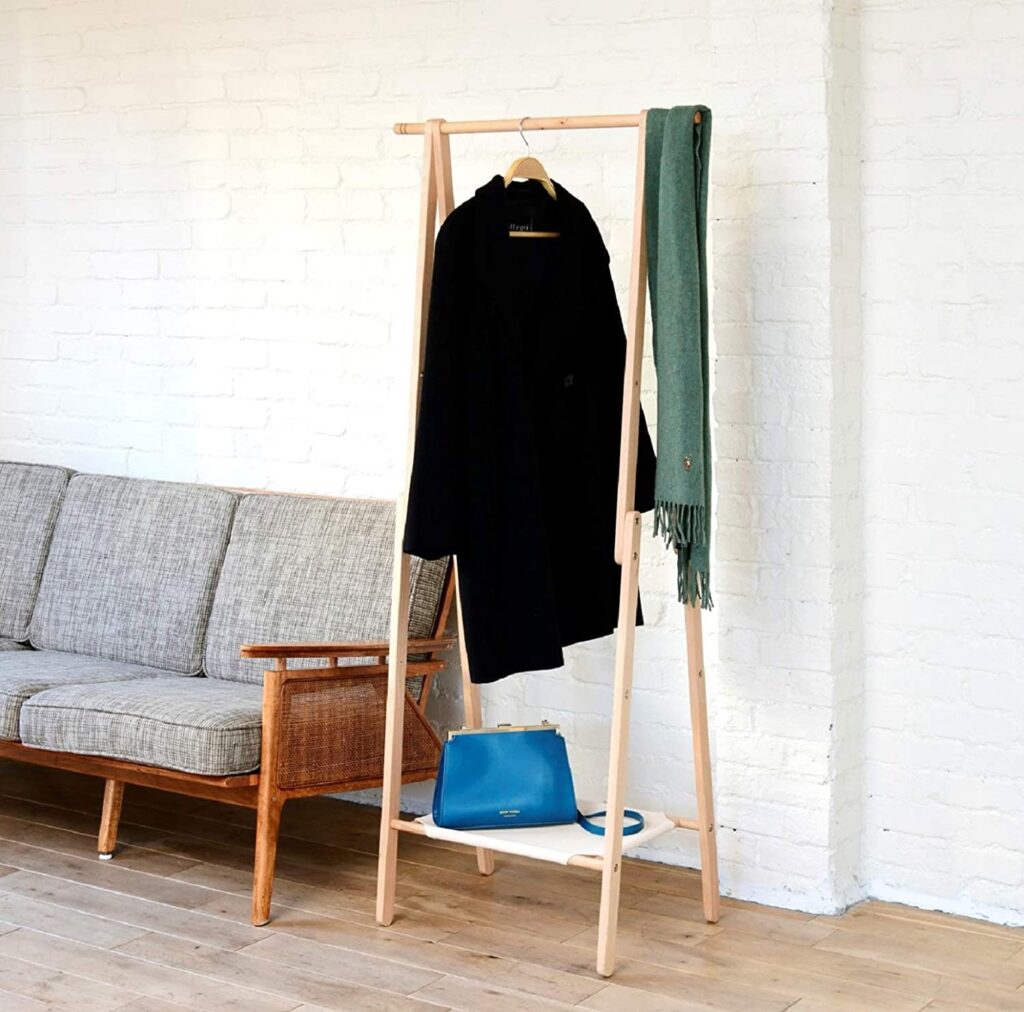 続いては、おしゃれな木製の「キャスター付きハンガーラック」。