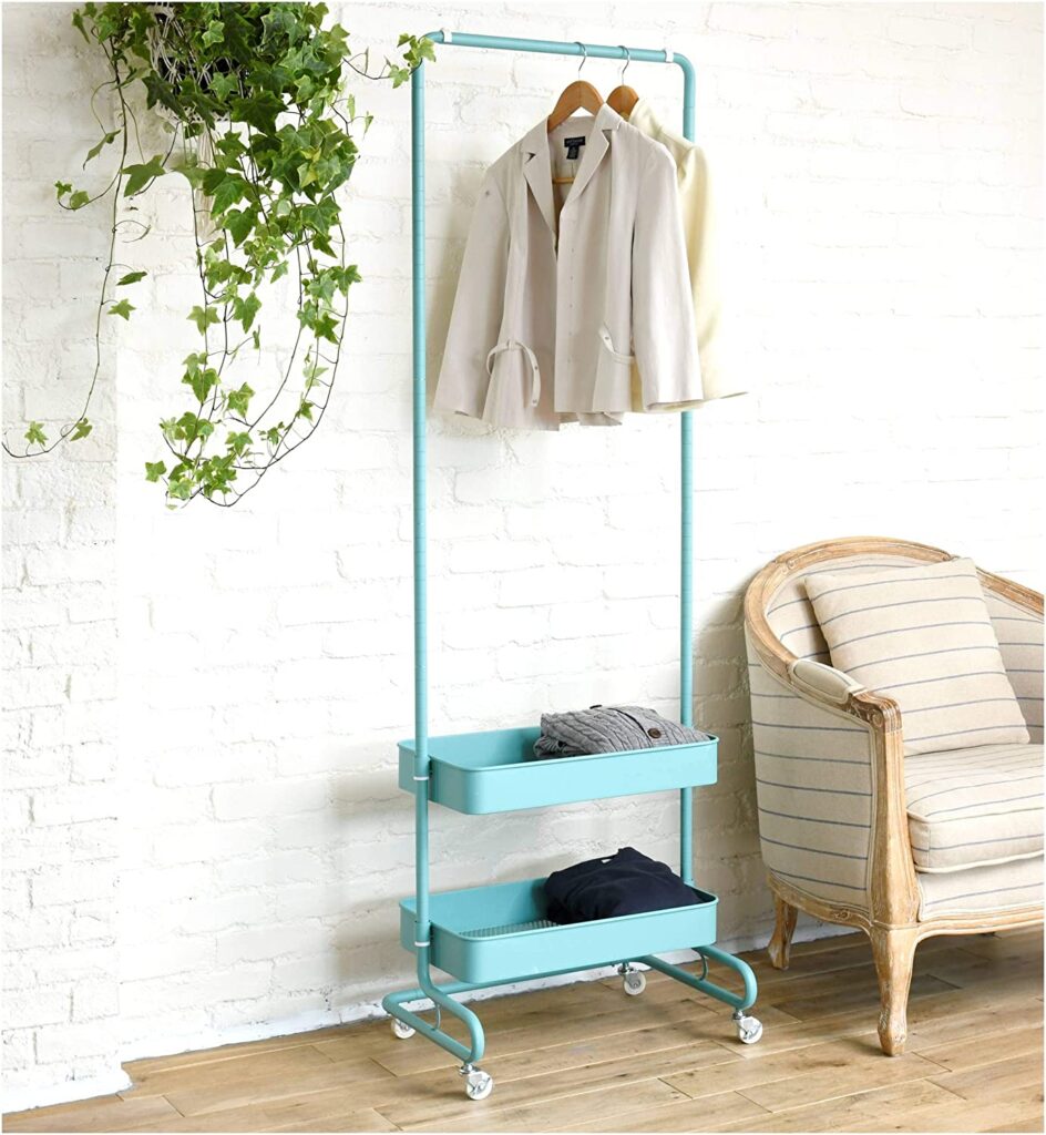続いては、明るいカラーがかわいい、バスケット付きの「キャスター付きハンガーラック」。