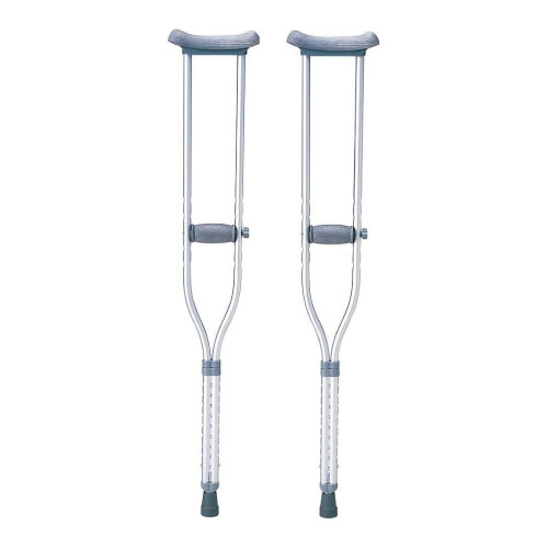 一般的な「松葉杖」は、上部が2又に分かれていて、最上部の横木(クッション部分)を脇の下に挟み、中央付近の持ち手を握って使用します。