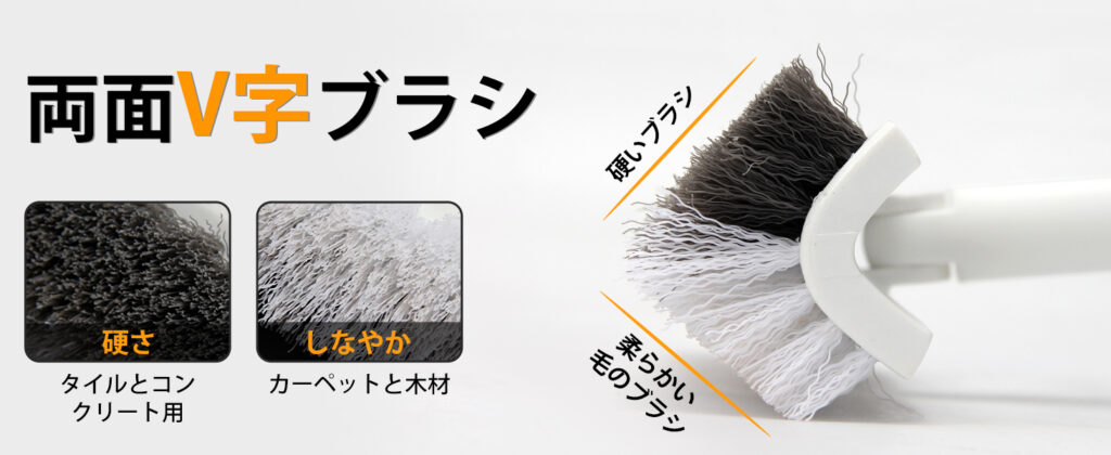 タイルやコンクリートに適した剛毛と、カーペットや木材に敵した柔毛の2種類が備わっています。