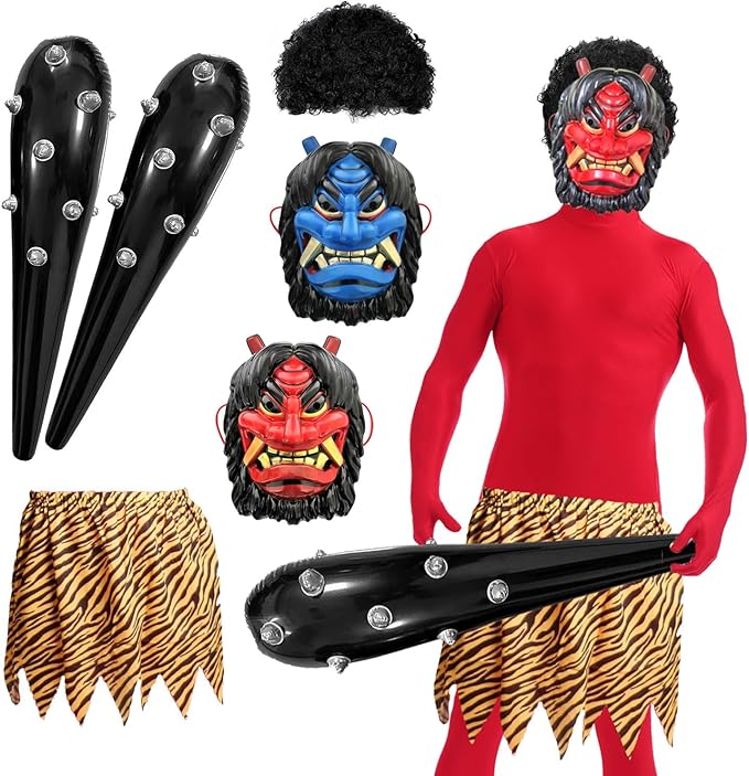 赤鬼のお面・青鬼のお面・ウィッグ・鬼のパンツ・こん棒2本がセットになっています。