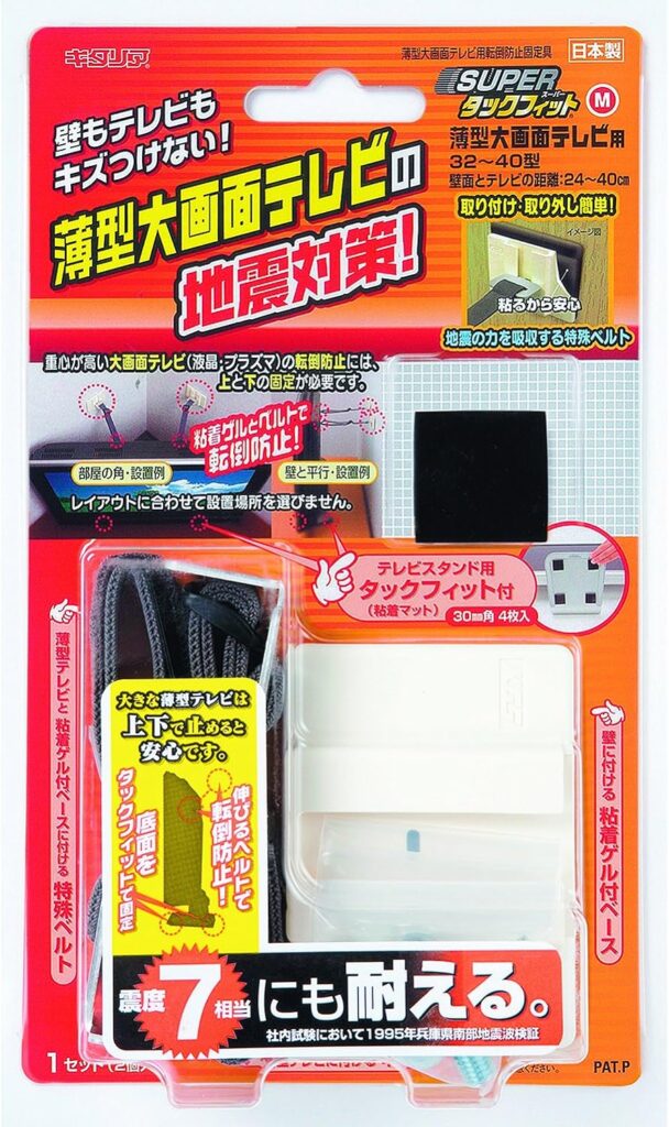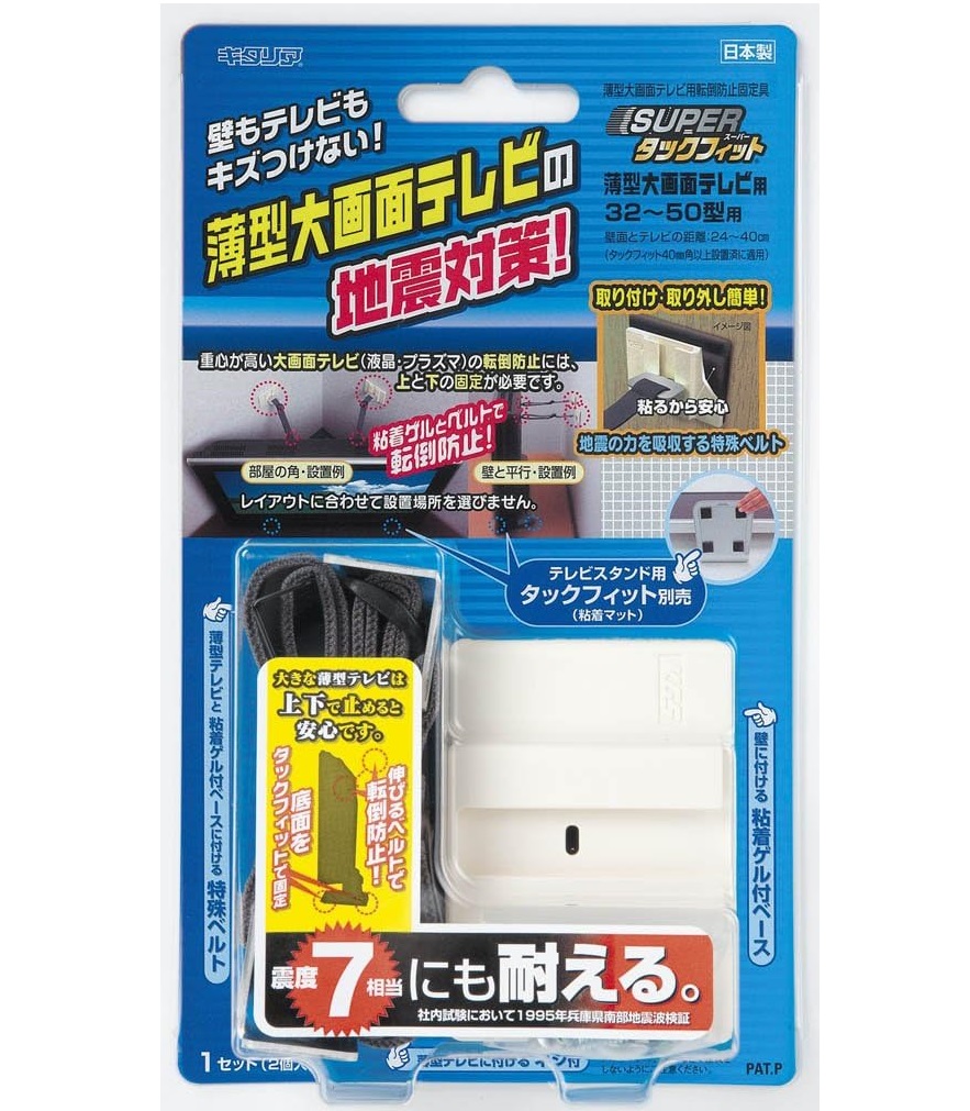 コーナン(ホームセンター)では、『北川工業 スーパータックフィット』という「テレビ転倒防止グッズ」が販売されています。
