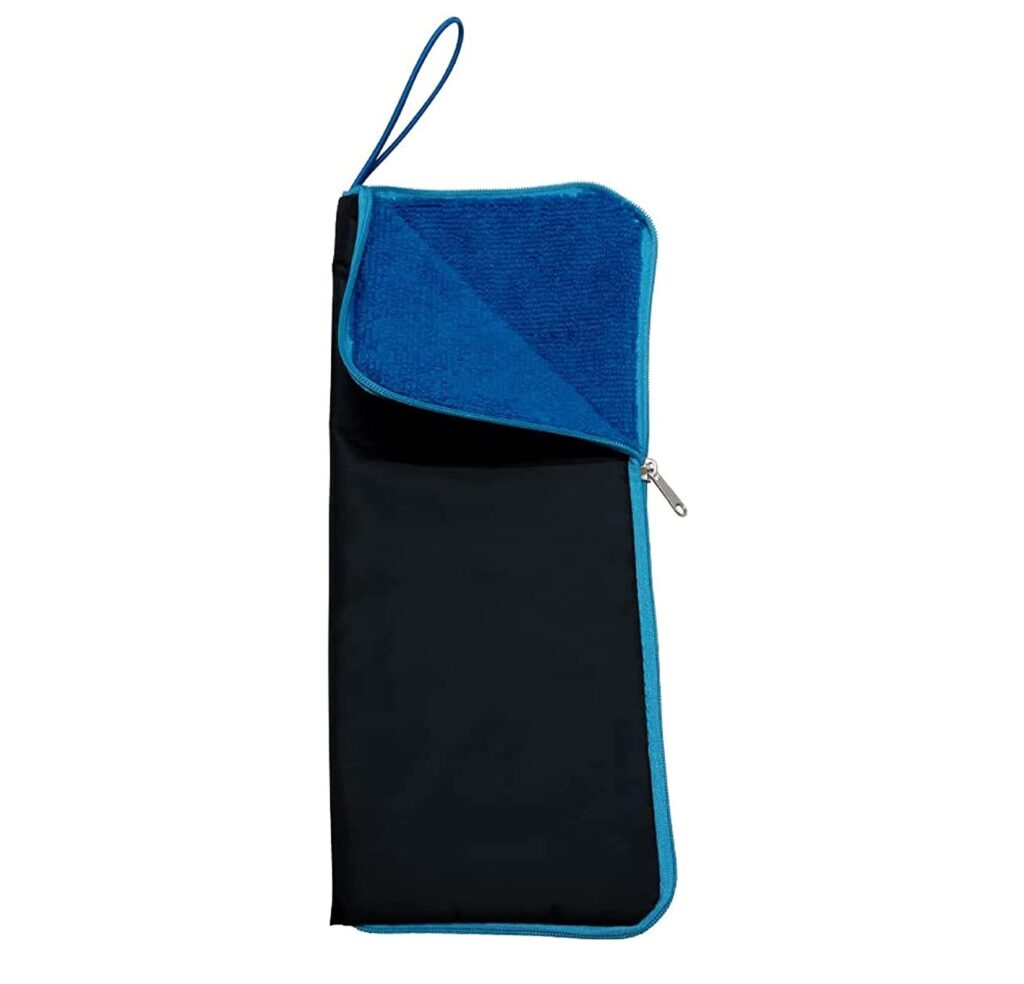 また、下画像のようにファスナーを大きく開くことができるので、濡れた鞄の表面を拭くなど、タオルとしても使用できます。