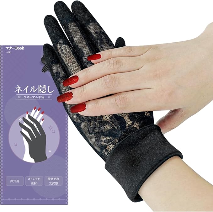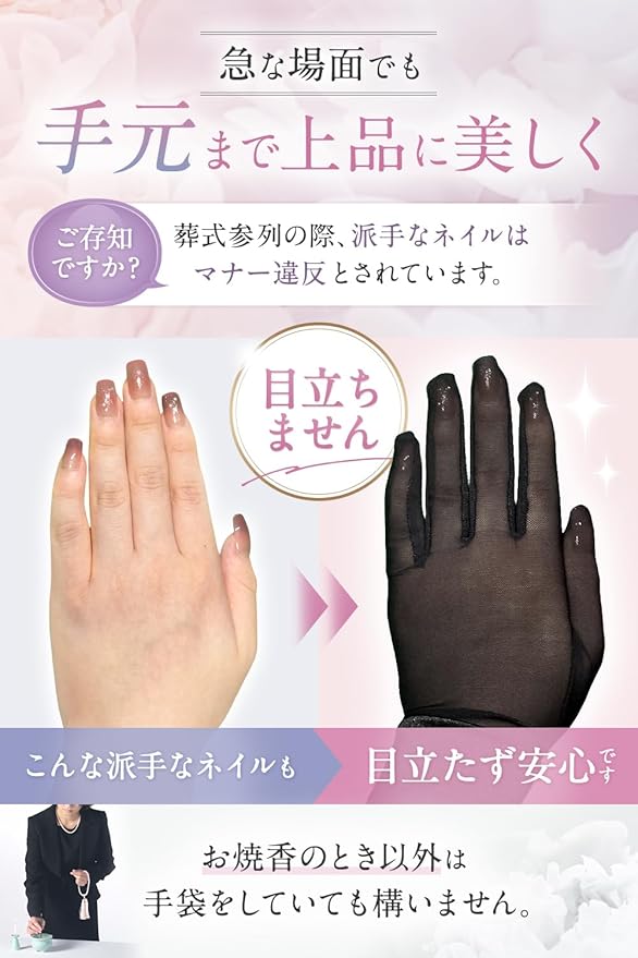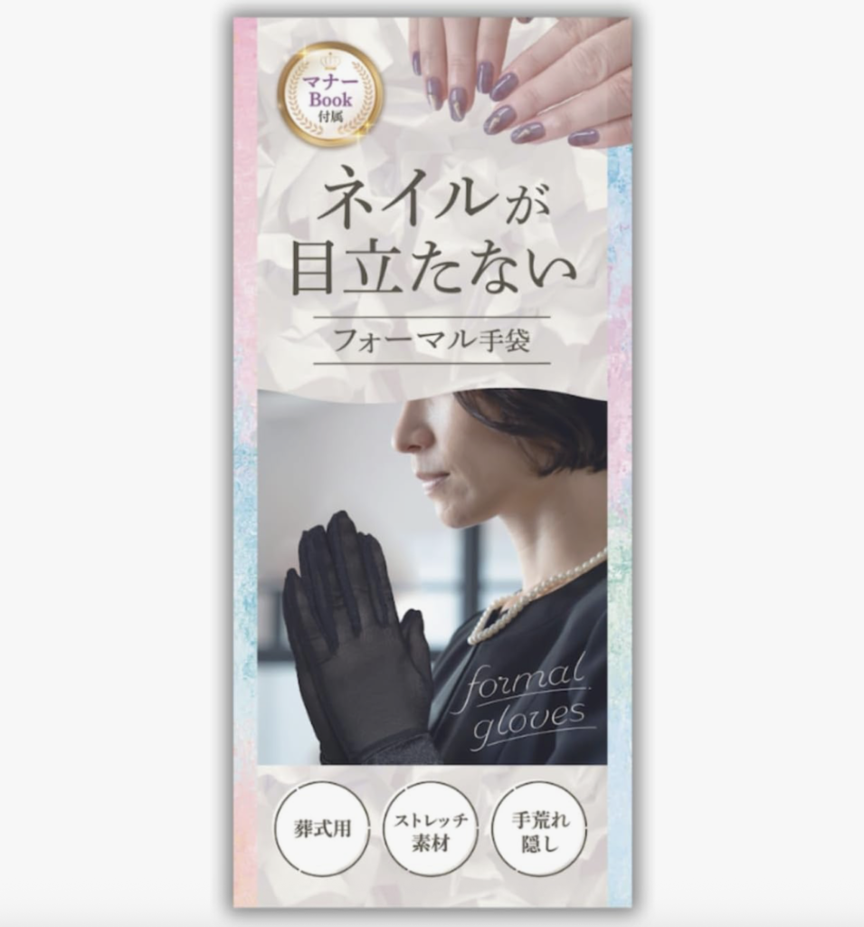 葬儀に参列する際、派手なネイルはマナー違反とされていますが、急な葬儀でネイルをオフする時間がない場合には「葬儀用手袋」が便利です。