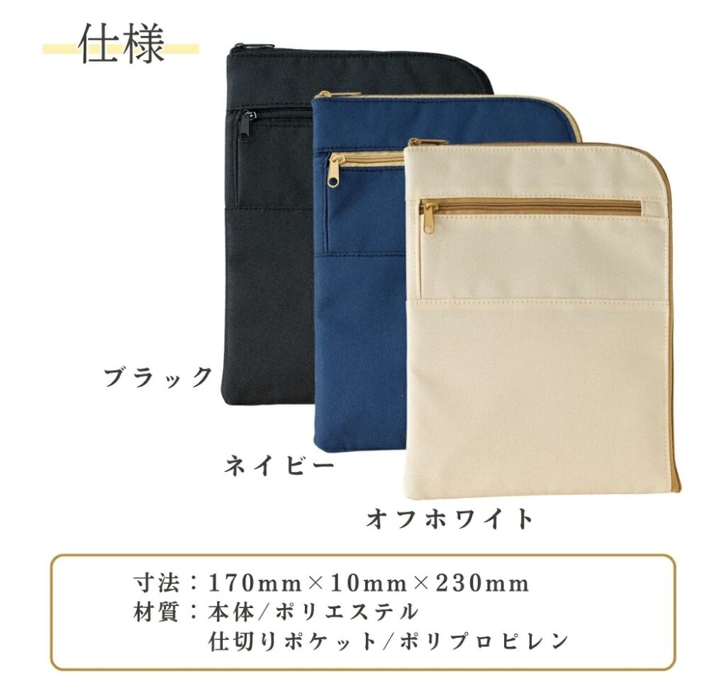 L字型のチャック付きで出し入れしやすく、かばんの中で飛び出す心配もありません。