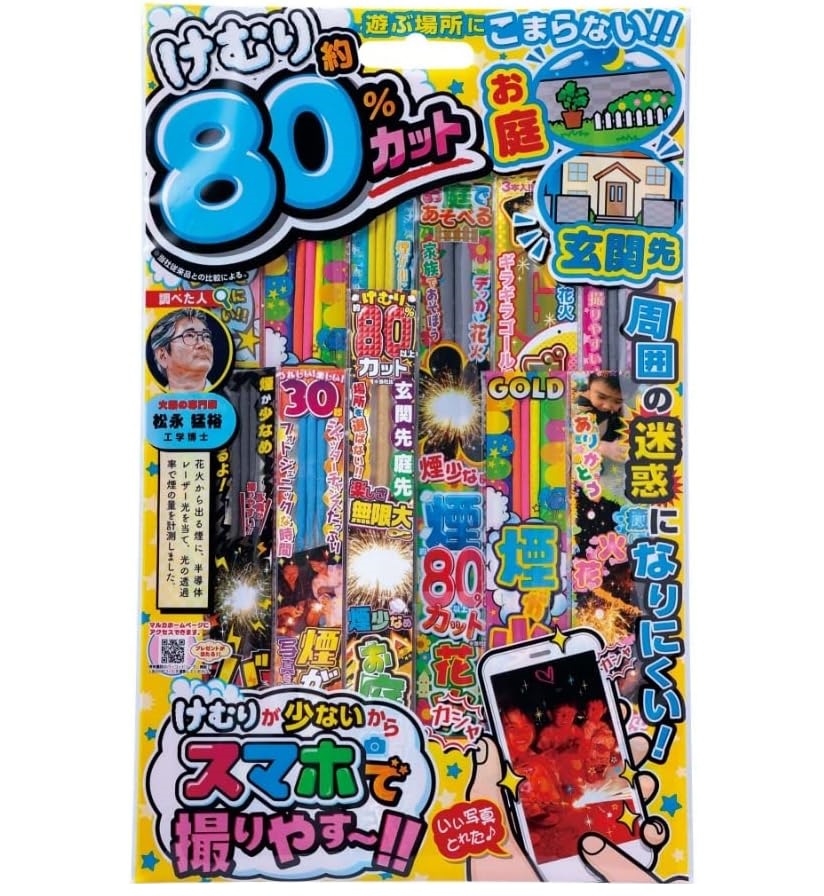 花火から出る煙の量が少ないので、住宅が密集した場所の玄関先や、庭先でも遊びやすいです。