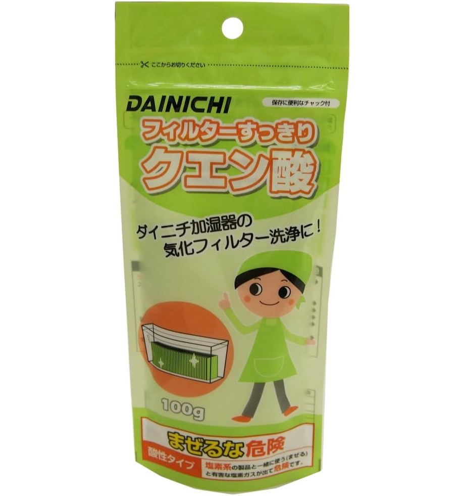 ダイソー(100均)では『クエン酸 粉末タイプ』が販売されていて、「加湿器フィルター用洗剤」としておすすめです。