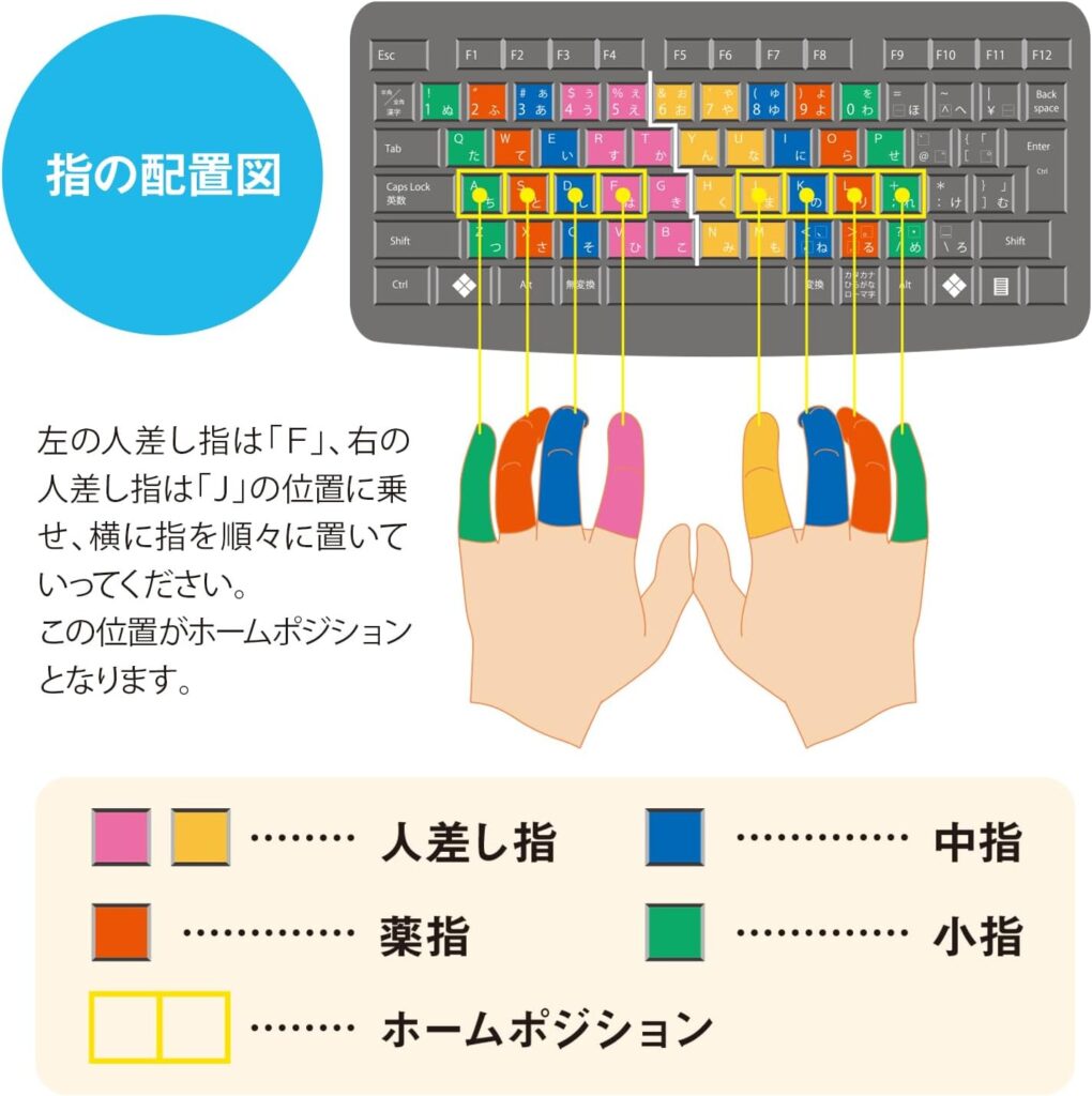キーを叩く指によって色分けがされており、見ながらタイプ練習するのに適している。
