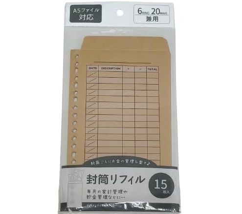 キャンドゥ(100均)で販売されている『A5ファイル』と『6穴20穴兼用封筒リフィル』を組み合わせて、「お金管理ファイル」として使用できます。
