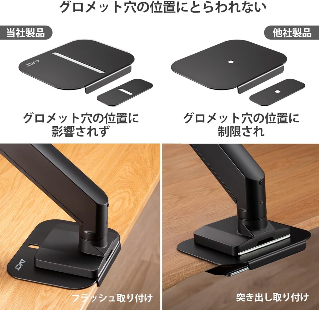 グロメット式用の穴が長く設けられているので、モニターアームやデスクの形状を選ばず使いやすいです。