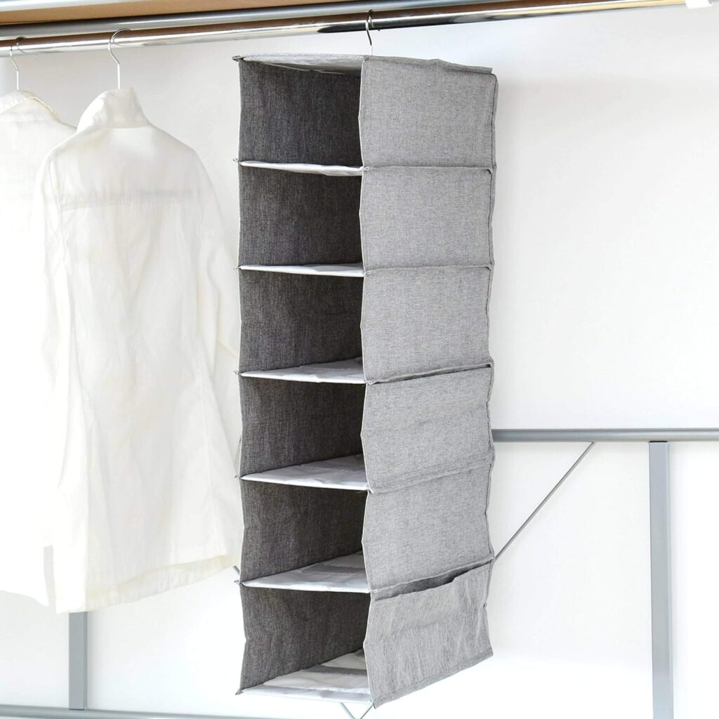 丈夫なポリエステル製の吊り型ラックで、クローゼットなどのポールに吊るして使用します。
