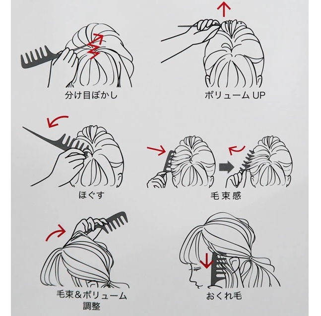 下画像のように先端や櫛の部分で、分け目ぼかしボリュームアップなどさまざまな使い方ができます。