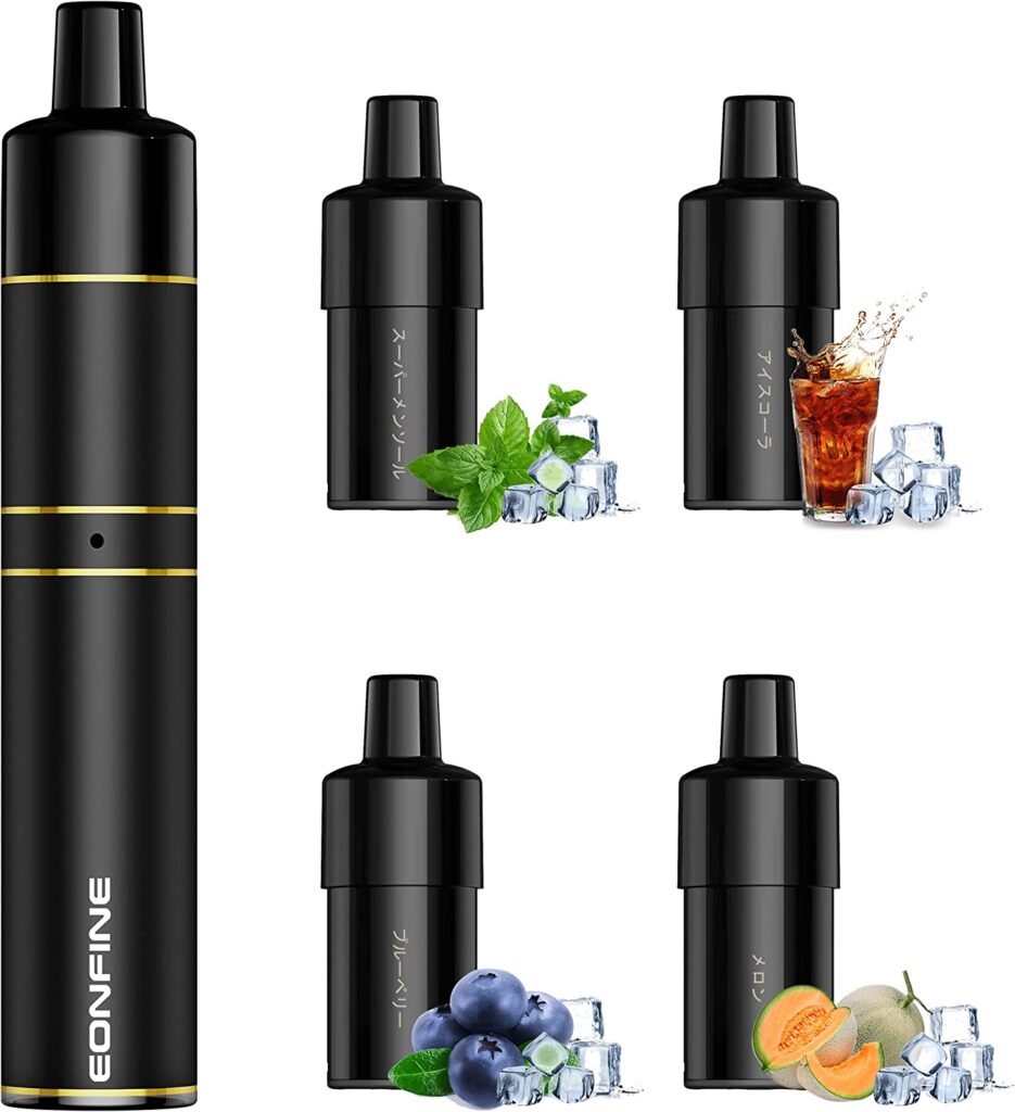 スーパーメンソール・コーラ・メロン・ブルーベリーの4つのフレーバーカートリッジと、本体、充電ケーブルのセット商品です。