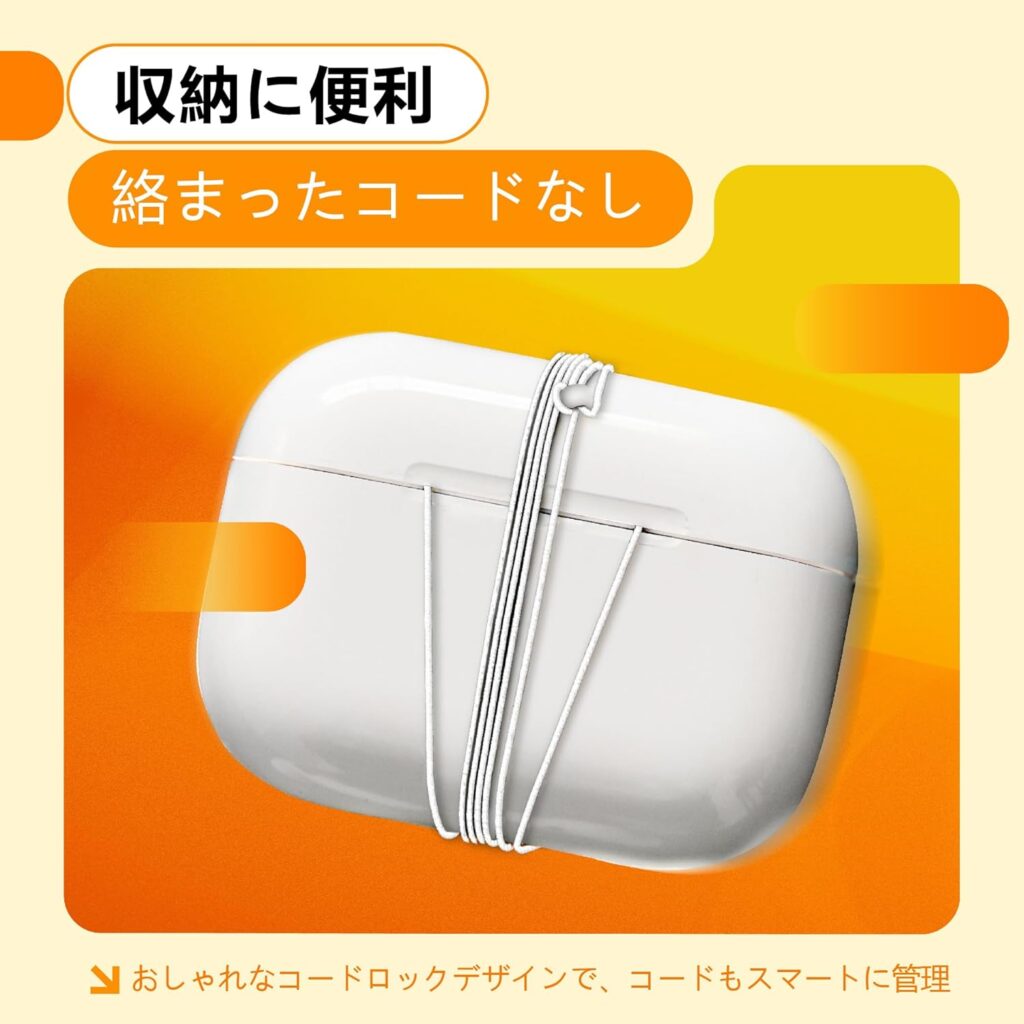 また、下画像のように充電ケースにコードを固定できる構造で、絡まる心配がありません。