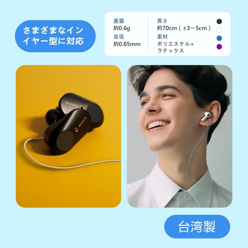 ポリエステルとラテックスでつくられたコードで、ワイヤレスイヤホンを繋ぎ合わせることで落下を防止できます。