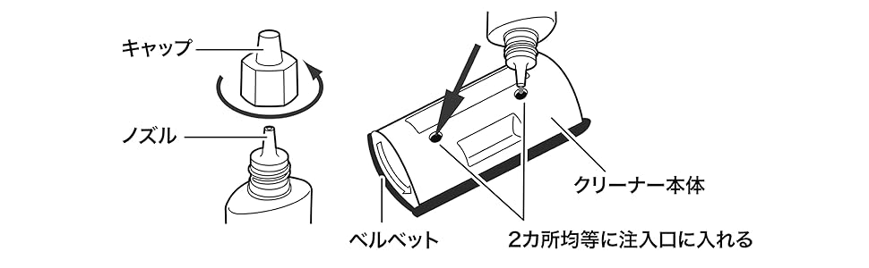 下画像のように、本体の注入口にクリーニング液を垂らし、しっかりと浸透させることができます