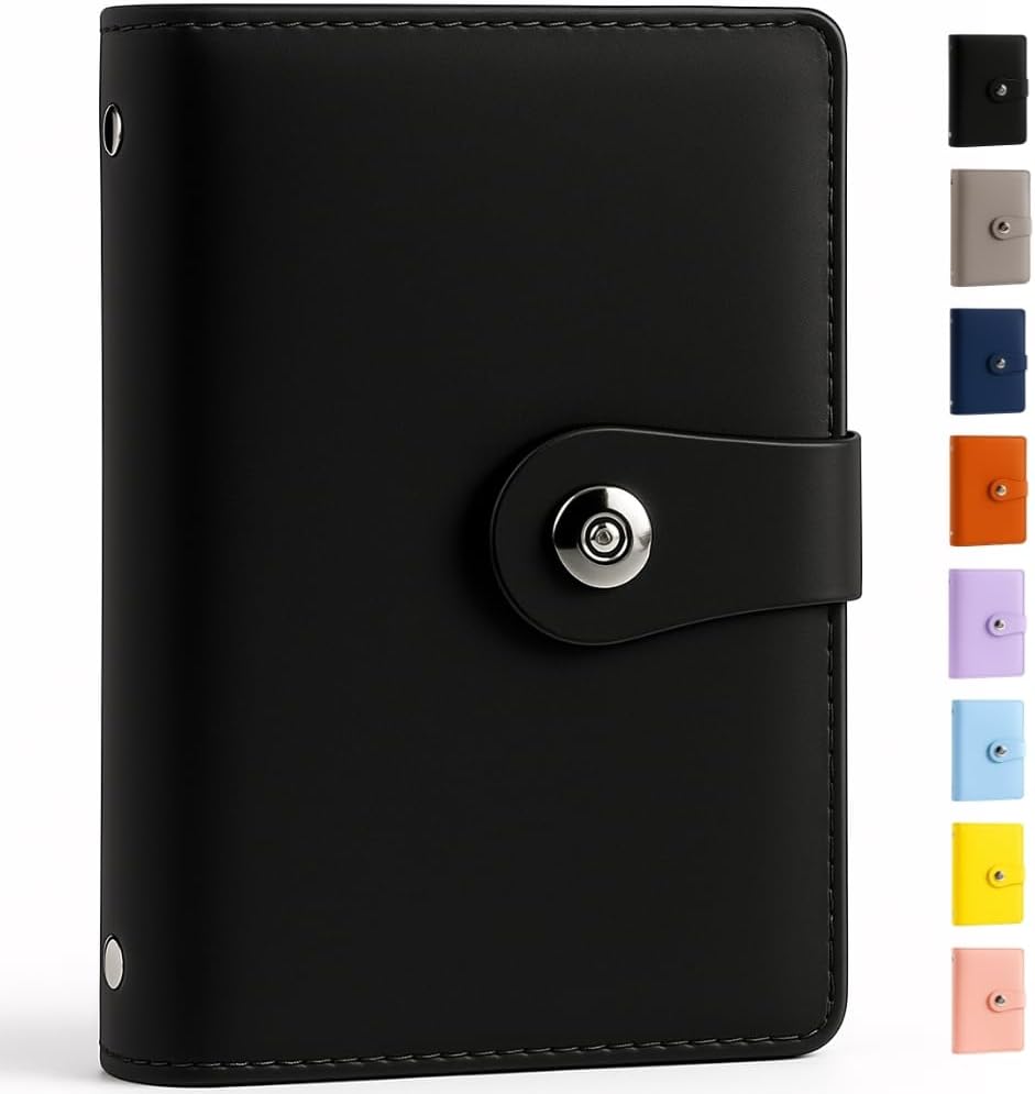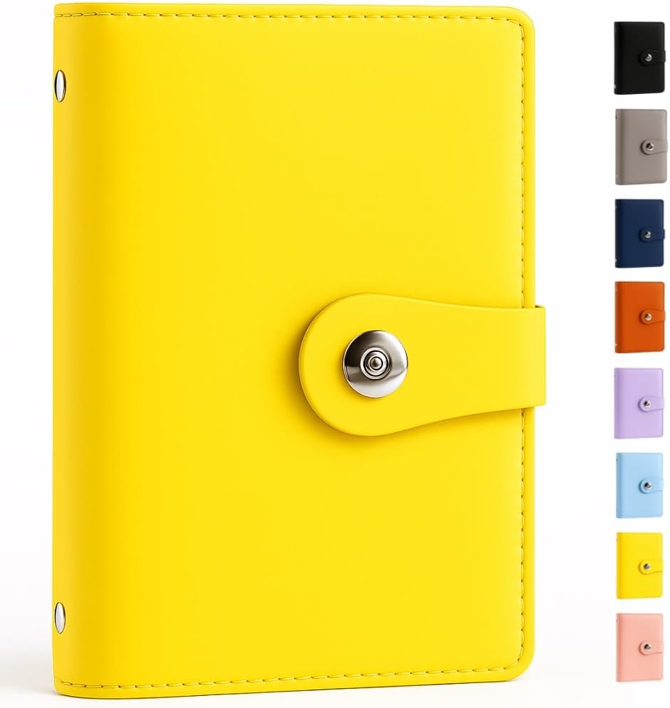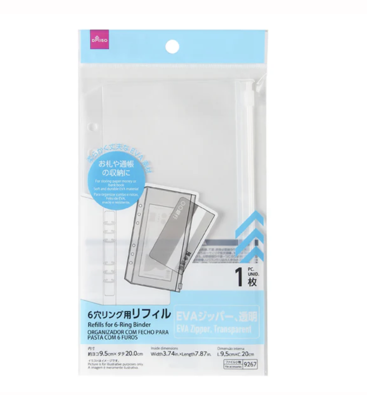 6穴式のバインダーで、ファスナー付きのクリアポケットが12枚付属されています。