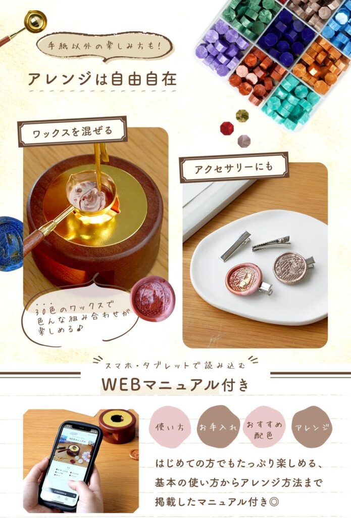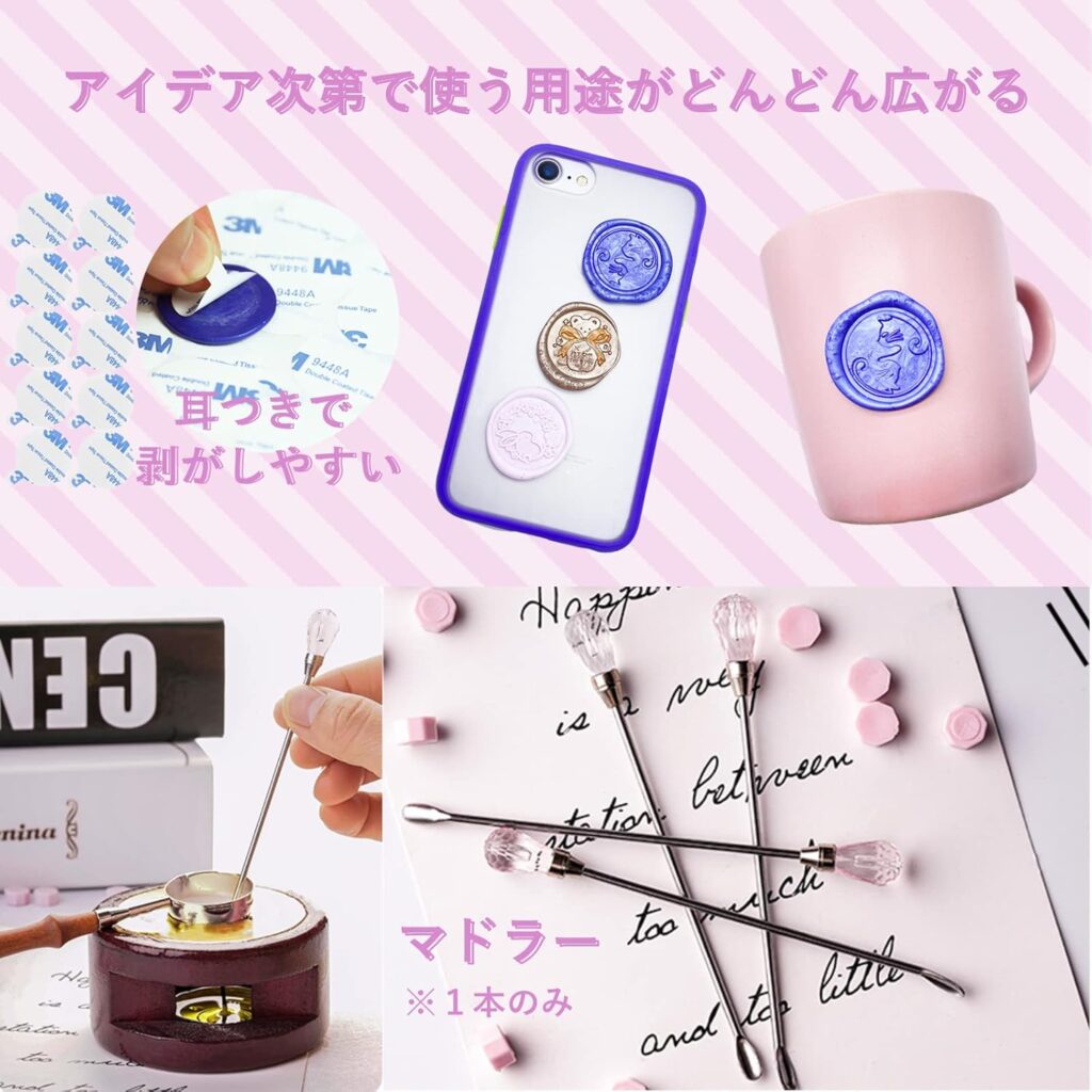 その使い道は幅広く、封筒を封印するためだけでなく、シールとして貼り付けたり、ヘアピンやブローチなどのアクセサリーに加工したりと、さまざまなアレンジができます。