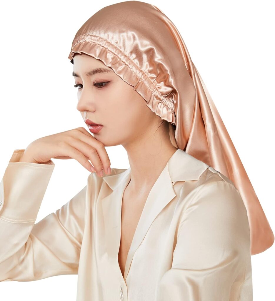 寝ているあいだに髪が絡まるのを防ぐ「シルクのナイトキャップ」。