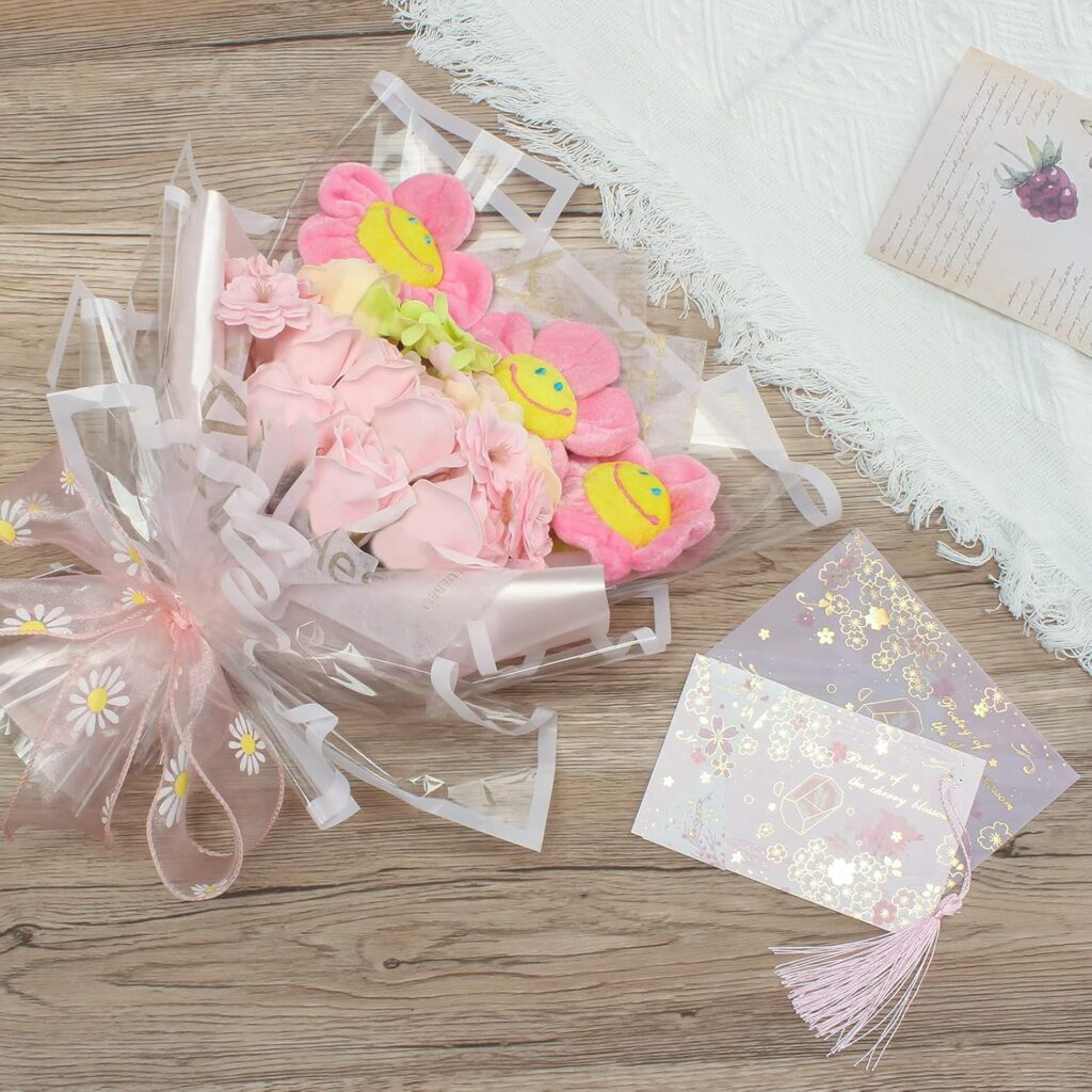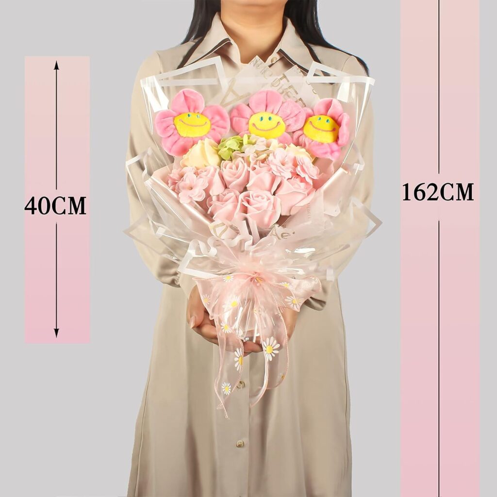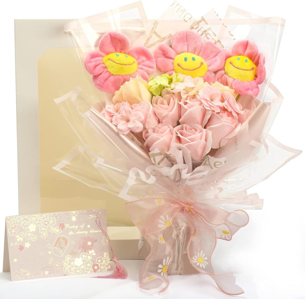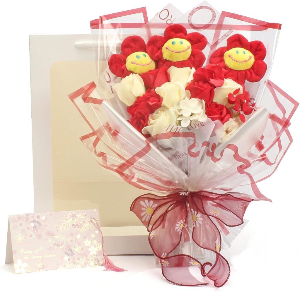 かわいいスマイルフラワーのぬいぐるみとソープフラワーがセットになっています。