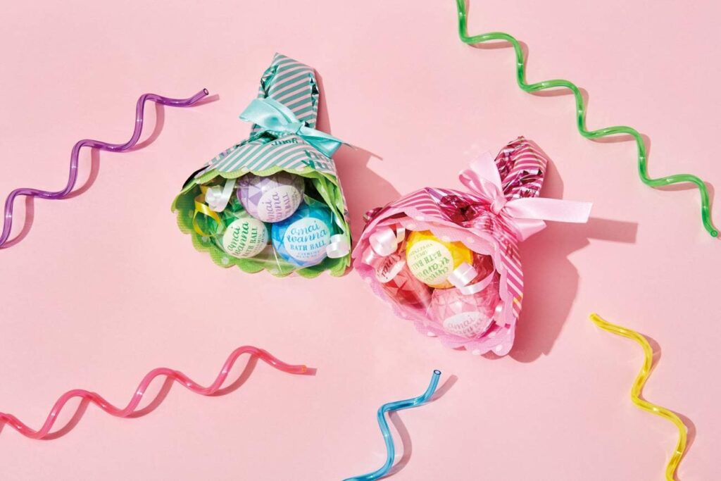 3種類のバスボムがブーケ状にデコレーションされています。