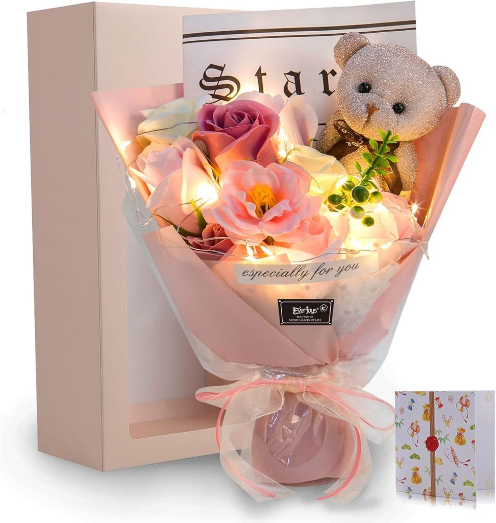 石鹸として使えるものや、クマのぬいぐるみ付きのもの、おしゃれなブーケ型のものなど、さまざまな「ソープフラワー」が展開されています。