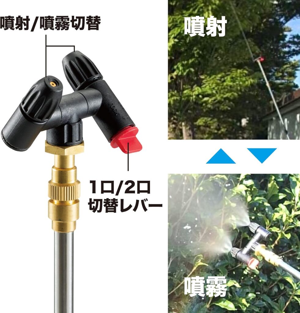 延長パイプ付きのロングノズルで最大110cmまで届くので、高い場所への噴霧用にもおすすめです。