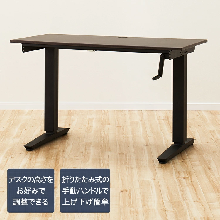 向かって右側に付いている折りたたみ式のハンドルを回すことで、デスクの高さを調整することができます。