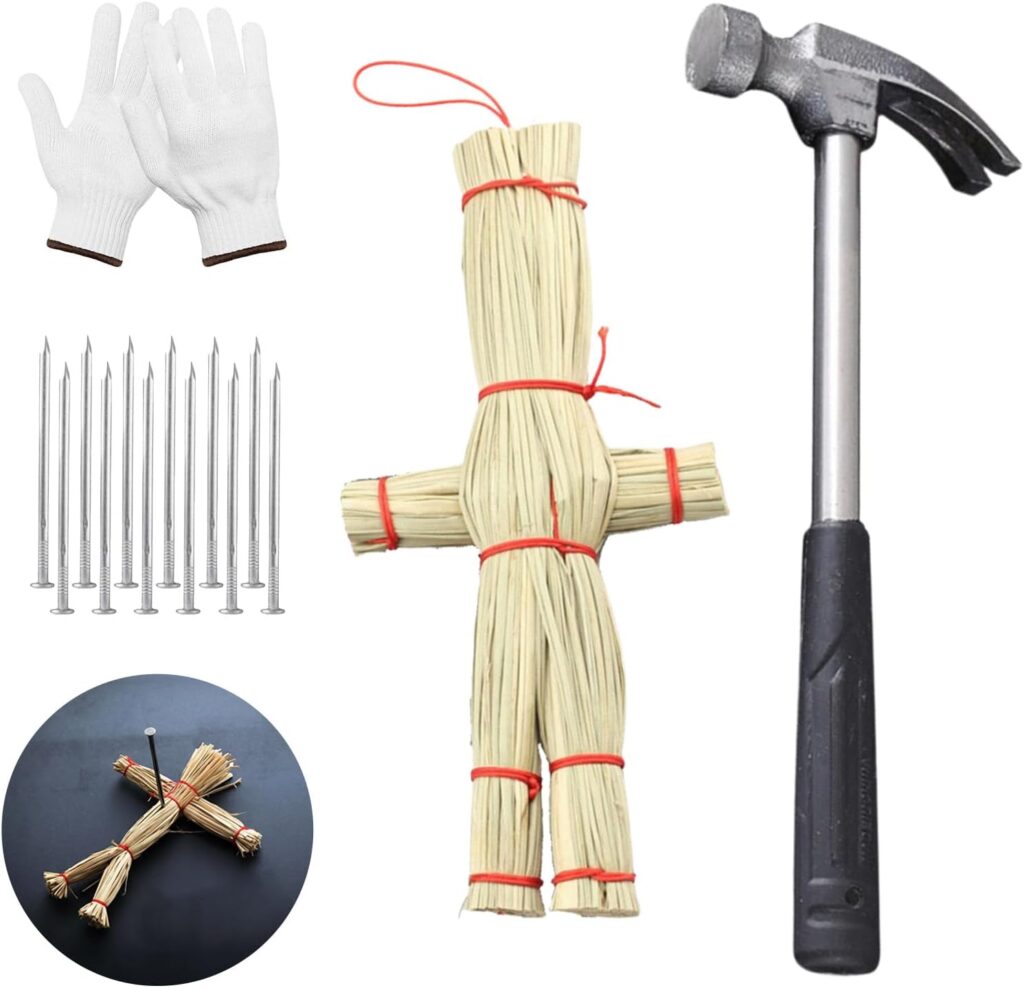 藁人形とハンマー、釘、軍手がセットになっています。