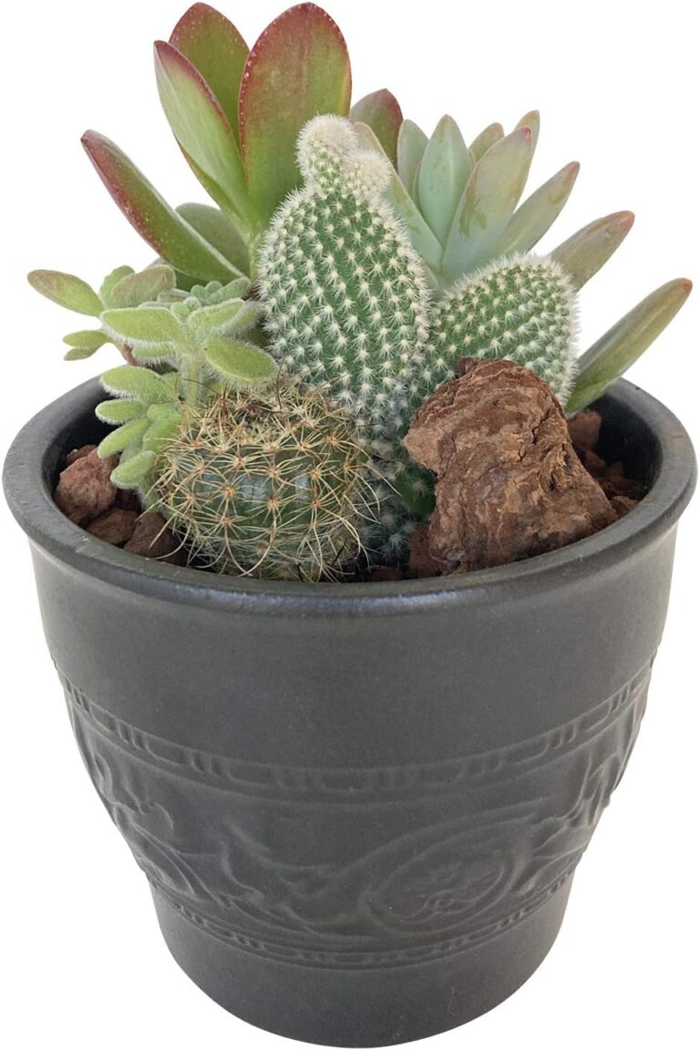 3種類の多肉植物と2種類のサボテンが、鉢いっぱいに詰まっています。